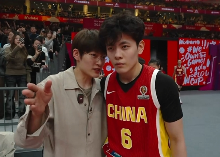 前任女篮队长杨力维场边指导现任女篮队长杨舒予。